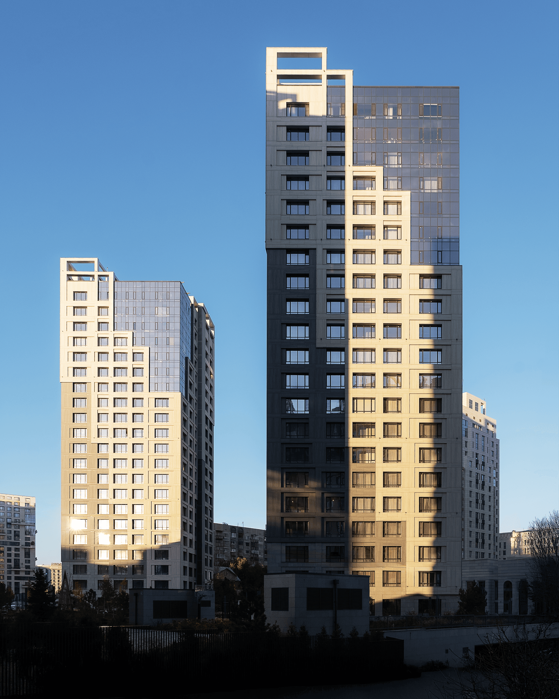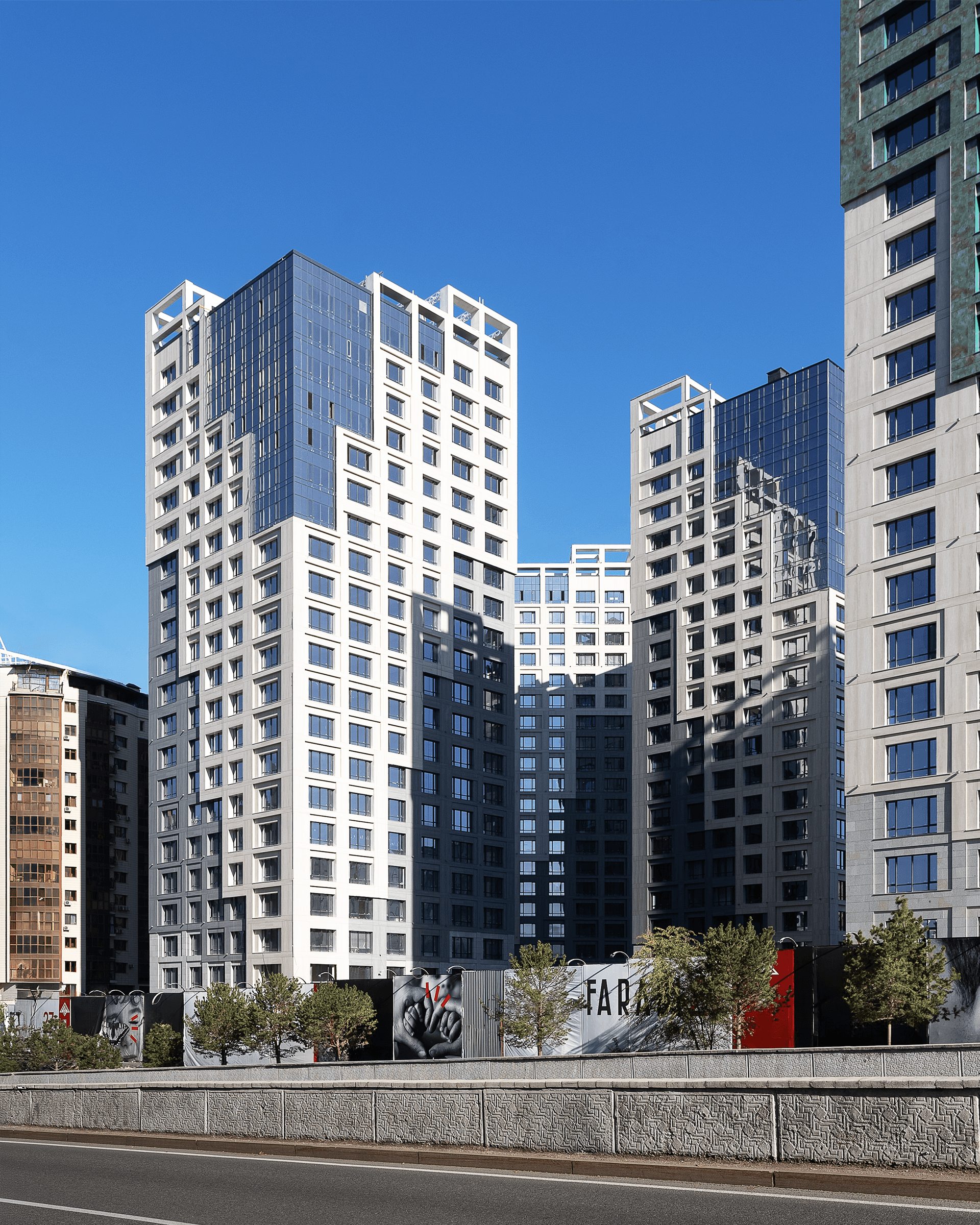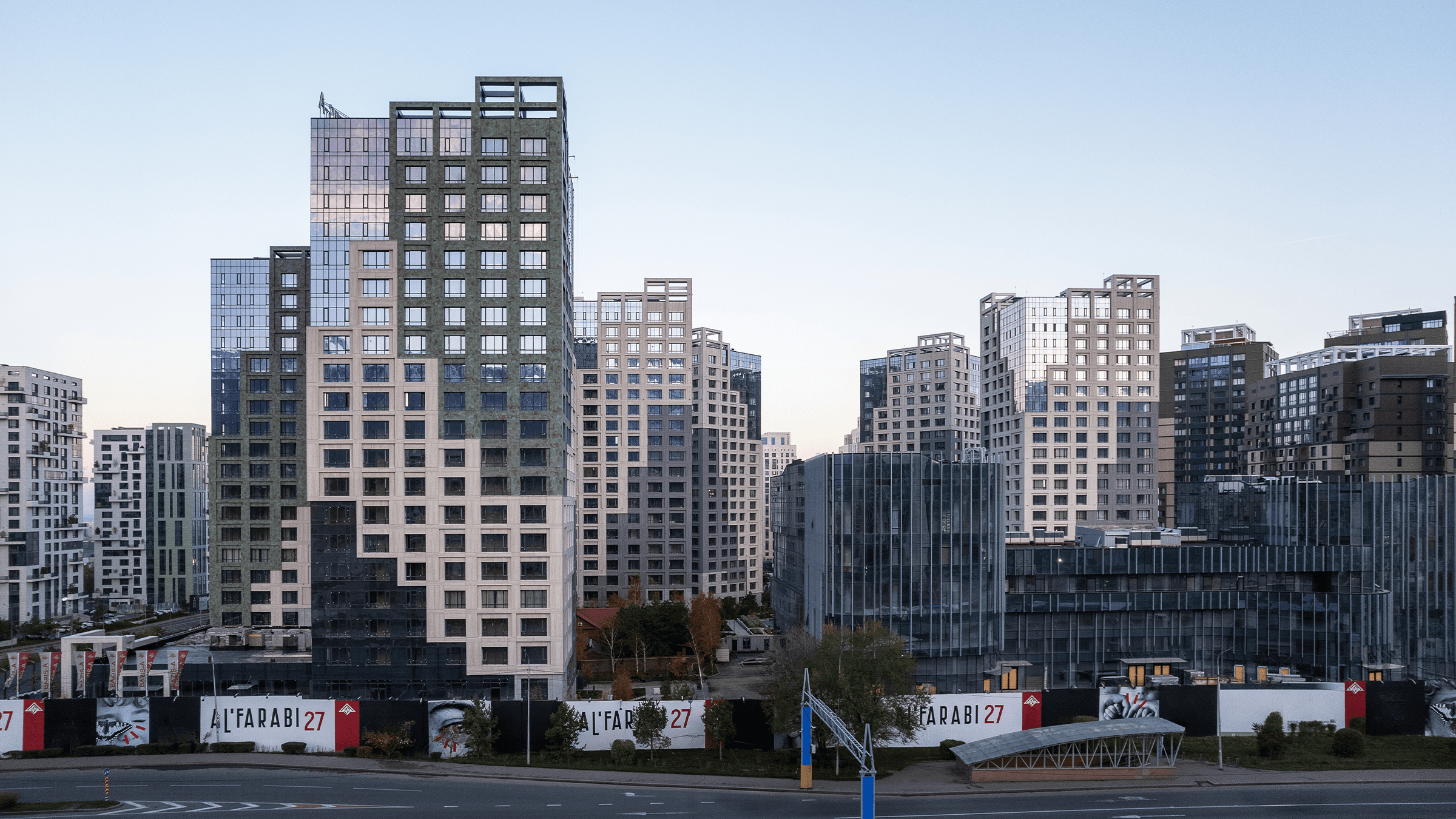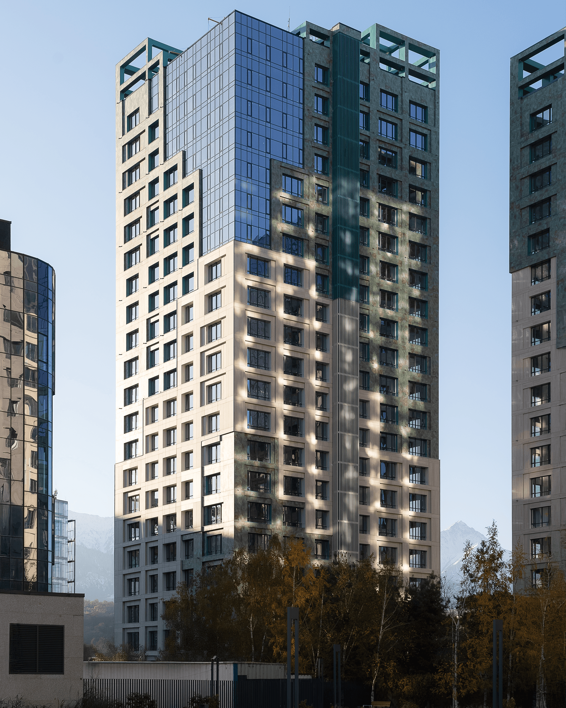 Al Farabi 27 is a contemporary urban ensemble where nature and architecture enter into a dialogue. The sculpted façade creates an expressive play of light and shadow, forming a dynamic silhouette along Al-Farabi Avenue.Two groups of towers define a cohesive city panorama, balancing density with open spaces. Light stone, glass and accents of patinated copper highlight the tactile quality of the architecture and reference the natural materials of the region.Stepped verticals, corner glazing and open loggias provide panoramic views of the Alatau mountains and the city while filling the interiors with light. The inner courtyards offer private green oases with landscaping, children’s areas and recreational spaces connected to the surrounding urban fabric.Al Farabi 27 is an exploration of a new language of residential architecture, where nature and urban life complement each other and form a unified environment.