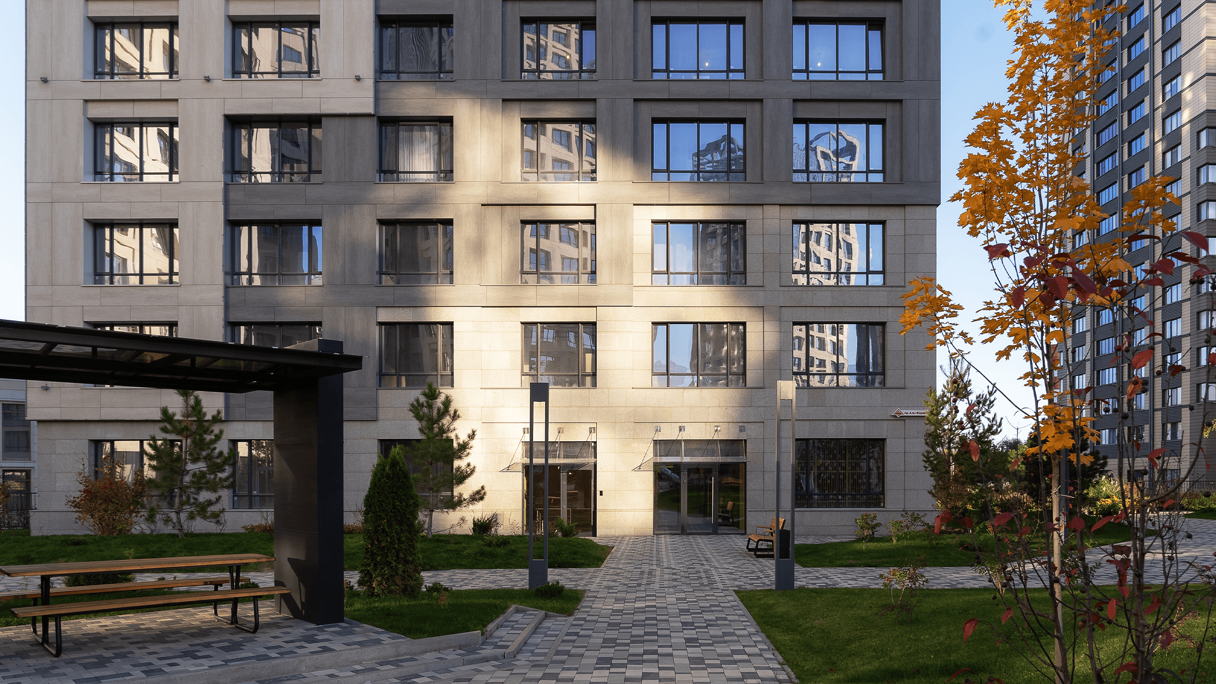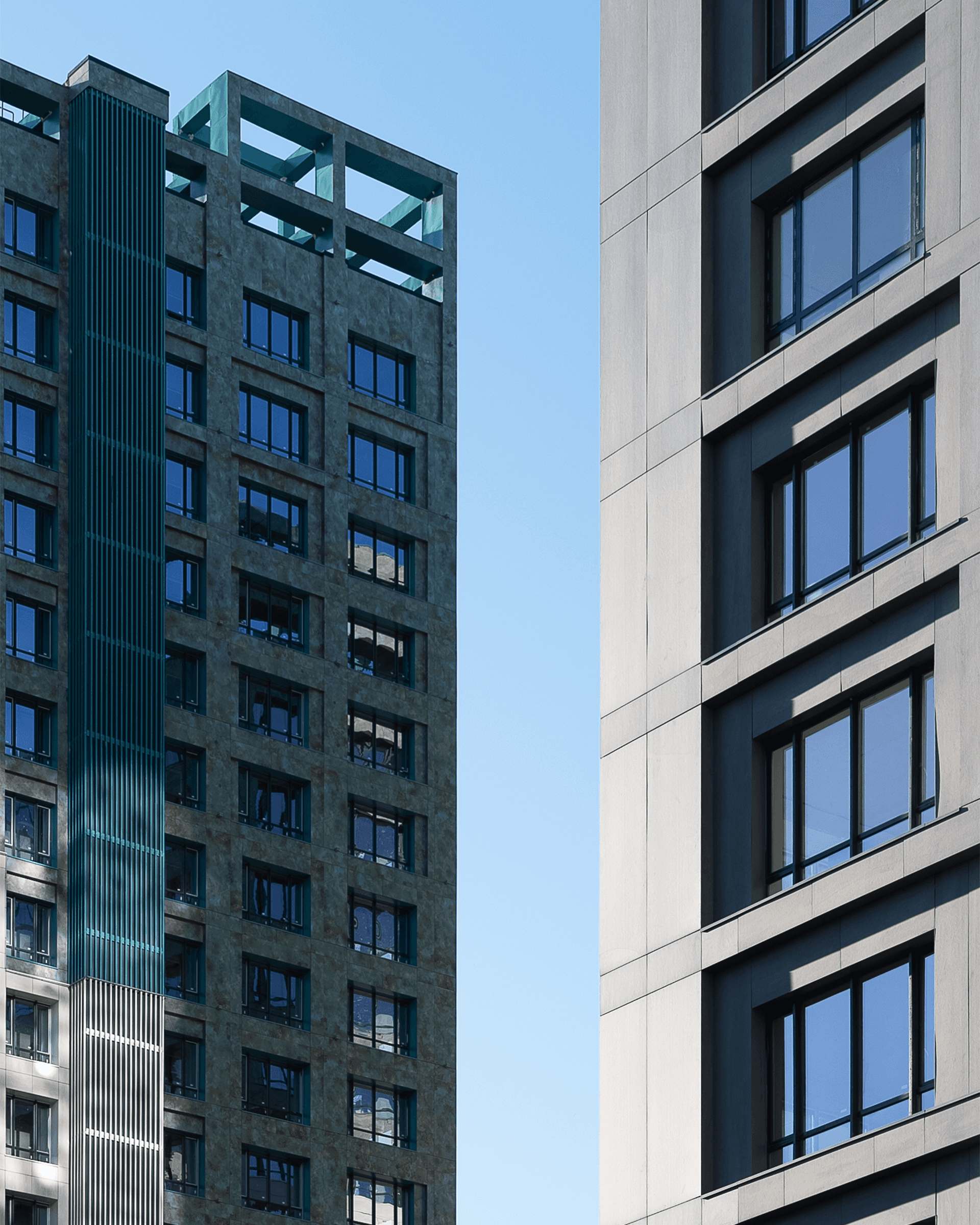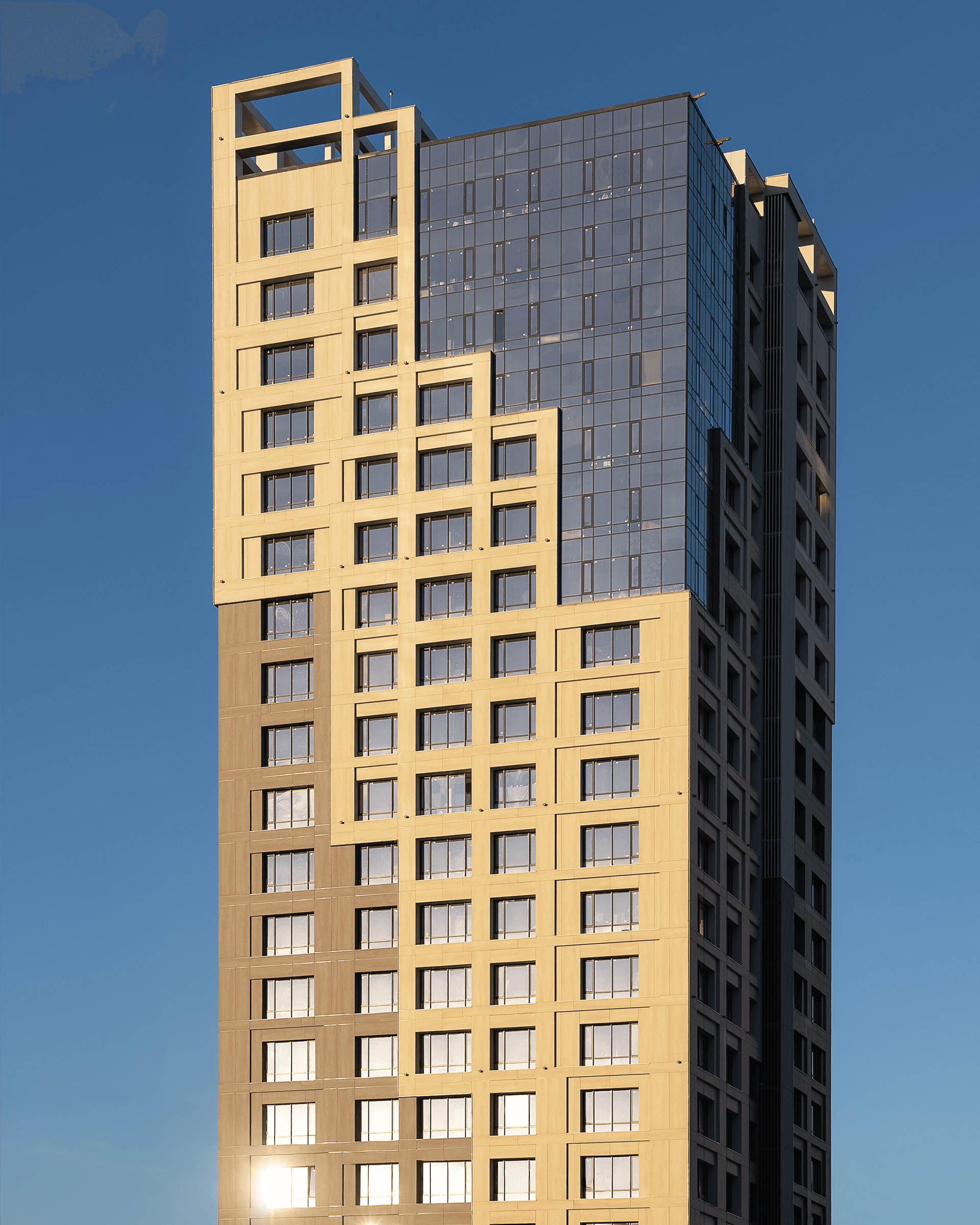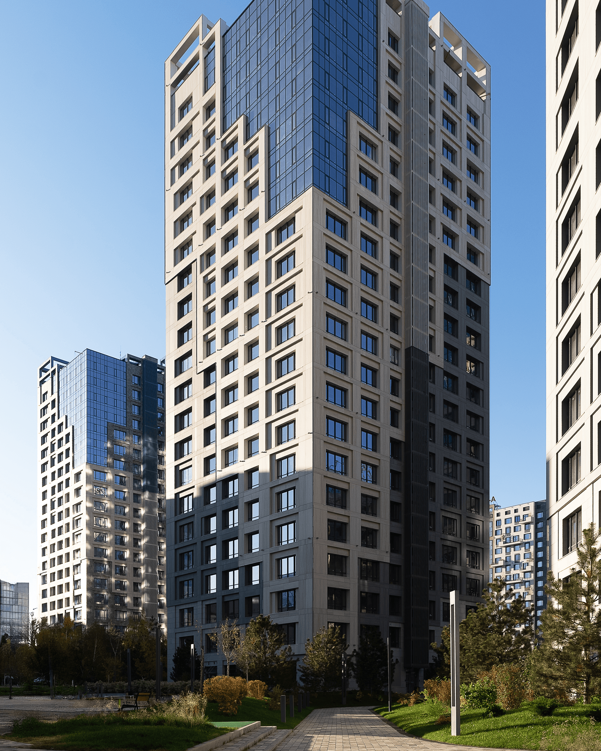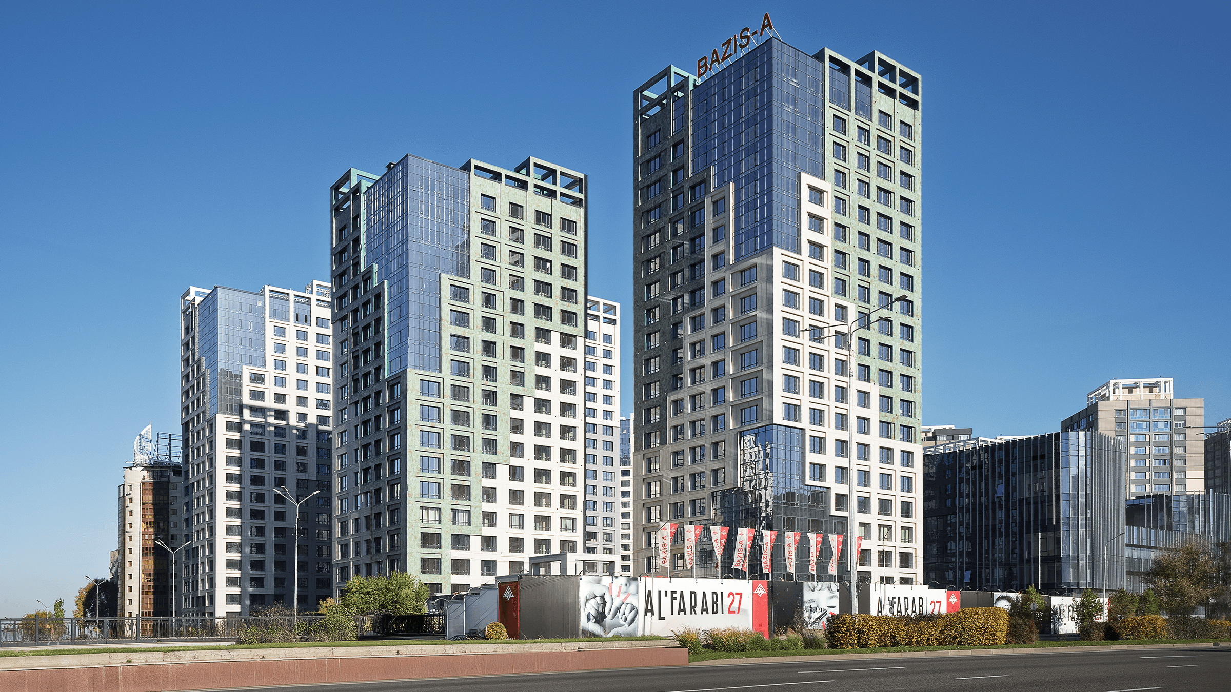 Al Farabi 27 is a contemporary urban ensemble where nature and architecture enter into a dialogue. The sculpted façade creates an expressive play of light and shadow, forming a dynamic silhouette along Al-Farabi Avenue.Two groups of towers define a cohesive city panorama, balancing density with open spaces. Light stone, glass and accents of patinated copper highlight the tactile quality of the architecture and reference the natural materials of the region.Stepped verticals, corner glazing and open loggias provide panoramic views of the Alatau mountains and the city while filling the interiors with light. The inner courtyards offer private green oases with landscaping, children’s areas and recreational spaces connected to the surrounding urban fabric.Al Farabi 27 is an exploration of a new language of residential architecture, where nature and urban life complement each other and form a unified environment.